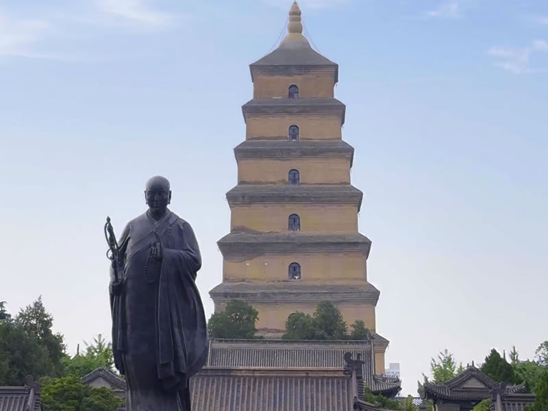 大雁塔,位于大慈恩寺内,是唐代佛教建筑艺术的杰出代表,也是古都西安的标志性建筑。 它最初是唐代高僧玄奘法师(唐三藏)为供奉从印度(天竺)带回的佛经、佛像和舍利而亲自主持修建的。大雁塔始建于唐永徽三年(公元652年),最初为五层砖塔,后经多次修缮和增高,现存为七层方形锥体楼阁式砖塔,高约64.5米。大慈恩寺是唐代长安城内最宏丽的皇家寺院,是当时重要的译经场所。在大雁塔周围,玄奘法师曾在此主持翻译经卷,对中国佛教文化的传播和发展产生了深远影响。如今,大雁塔区域已被开发成著名的旅游文化休闲区,包括北广场亚洲最大的音乐喷泉、大慈恩寺以及周边的仿唐建筑群。游客可登塔远眺,感受古城风貌,夜幕下的塔身灯光璀璨,展现出古朴与现代交融的独特魅力,承载着厚重的历史和宗教文化价值。